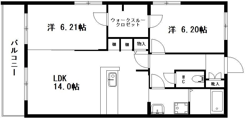 2LDK( LDK14畳/洋室6.21畳/洋室6.2畳 ) |